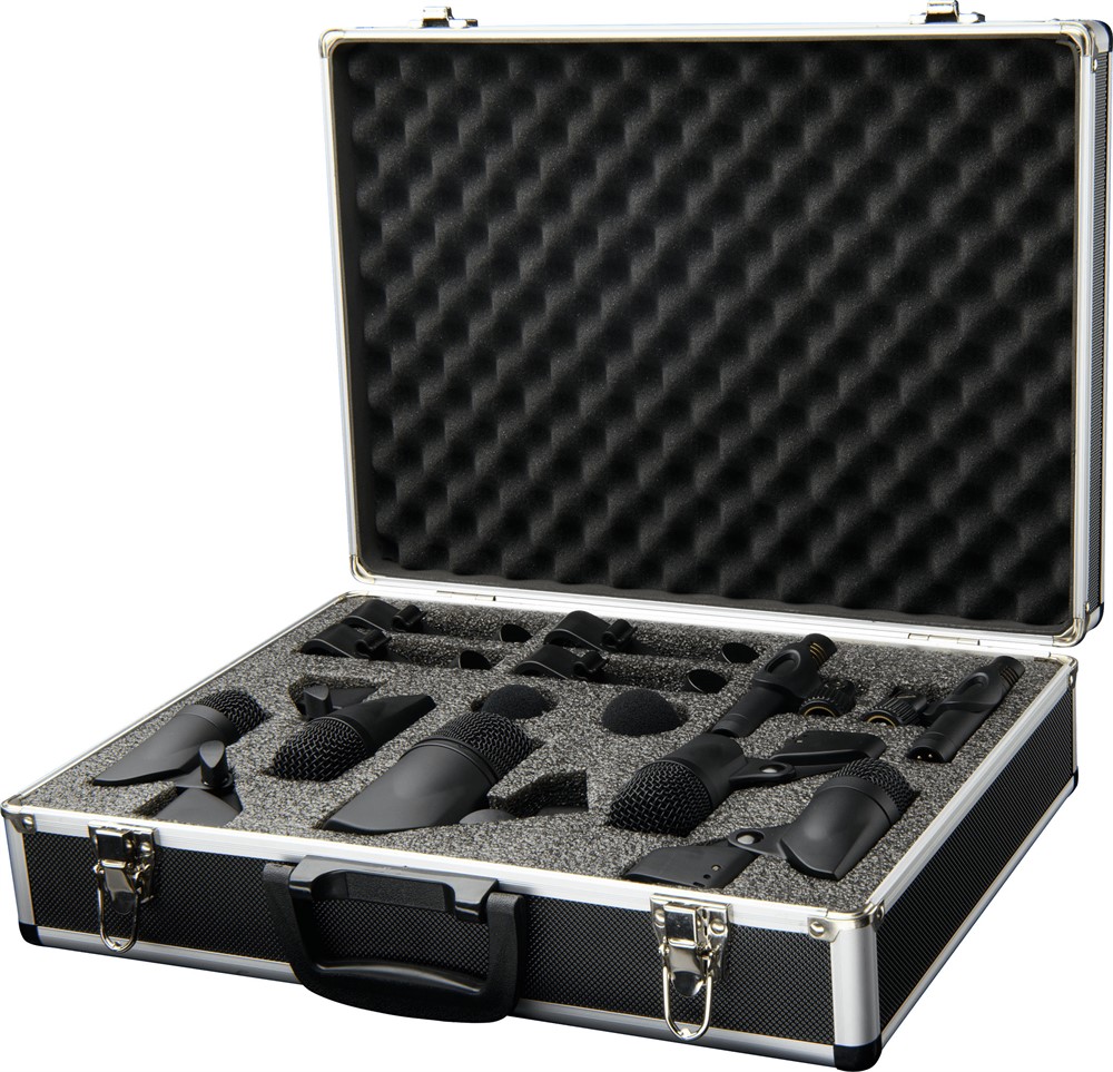 Complete drum microphone set for recording and live sound. 1 BD-1 kick drum mic, 4 ST-4 snare and toms mics, 2 OH-2 overhead and hihat mics plus mic holders, windscreens and hard case.