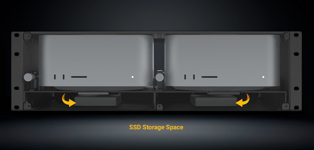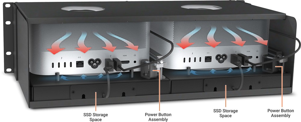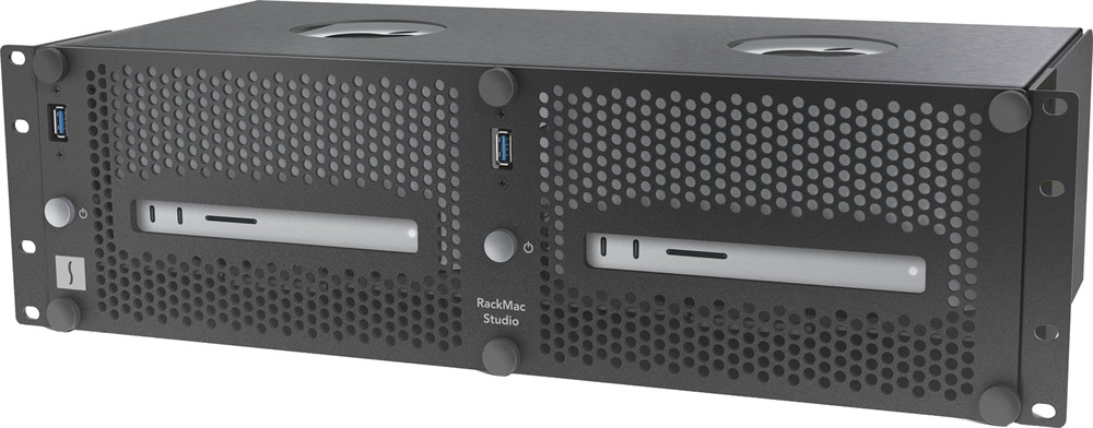RackMac Studio is a rugged steel 3U rackmount enclosure for securing one or two Mac Studio computers in a rack, placing them behind a quick and easy to remove front panel. Convenient front panel operation allows you turn Mac Studio computers on with their own dedicated front power buttons, connect USB devices through passthrough USB-A ports, and access the computers’ front ports and SD card slots. The RackMac Studio design enables you to connect and disconnect cables easily without needing to remove the computers from the enclosure.