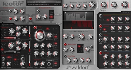 Lector is a vocoder with superior intelligibility and performance. The 100 band stereo vocoder core is flanked by a synthesizer section on the left and a rich effects section on the right. The intensities of up to 100 frequency bands in the analysis section control the same number of stereo bandpass filters in the synthesis filter bank using envelope followers with adjustable attack and decay. The integrated synthesizer or an external source serves as carrier signal and is fed into the synthesis filter bank. Besides the effects section, there are numerous features that make this vocoder unique.