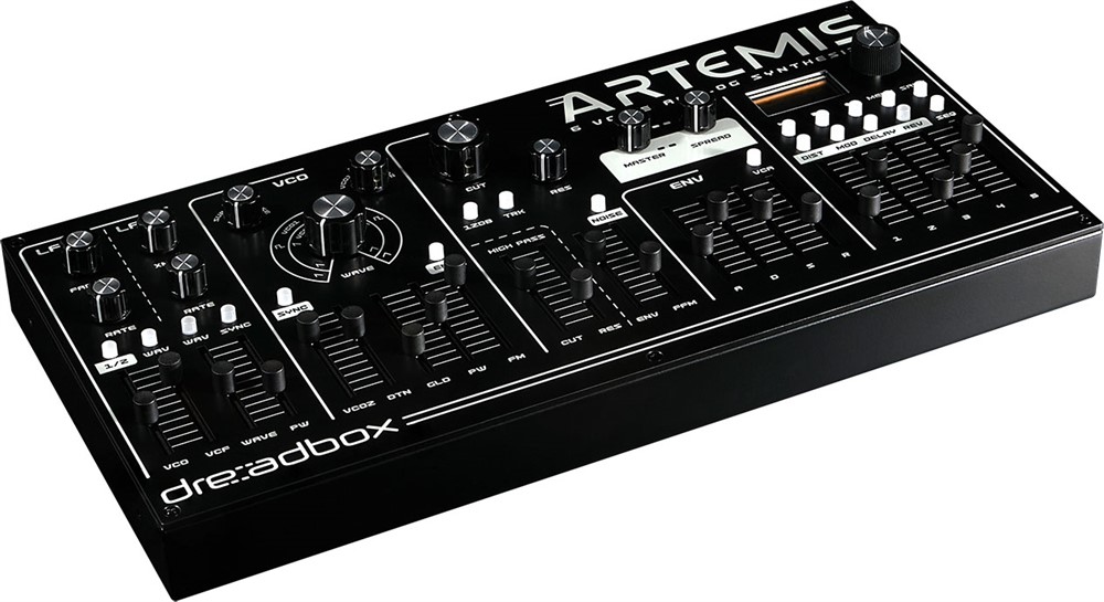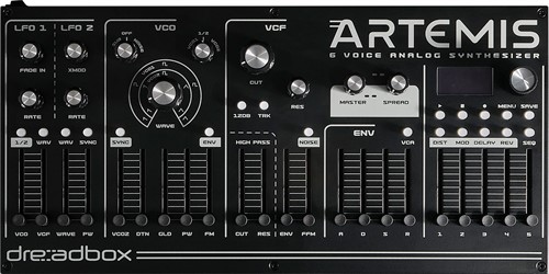 Dreadbox Artemis is a 6-voice polyphonic analog synthesizer featuring two VCO’s, along with a sub wave and a noise generator. Both oscillators offer sawtooth, square, and triangle waveforms, which can be configured into various settings via a dedicated knob. It includes two filters: a 24/12 dB super creamy low-pass resonant filter with keyboard tracking, drive and oscillator/noise FM, and a high-pass filter. Additionally, there are two ADSR envelopes – one dedicated to the VCA and another for the low-pass filter cutoff and VCO FM amount.