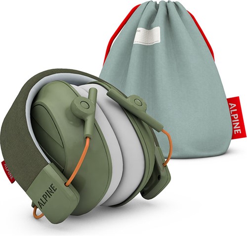 Hörselskydd designade för barn i ålder 5 till 16 år. Lljuddämpning på 25 dB (SNR). Silkesmjukt justerbart huvudband. Olivgrön färg. Small storlek. Levereras med tygpåse.