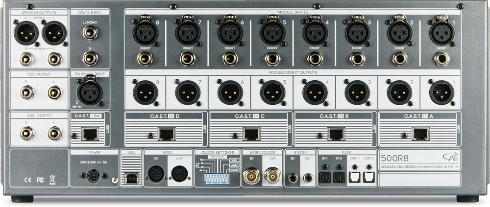 500R8 has 4 C.A.S.T. IN ports that allow you to connect C.A.S.T. enabled breakout boxes (such as the Cranborne Audio N22 and N22H) to 500R8 and relocate analogue I/O wherever it is needed around the studio.