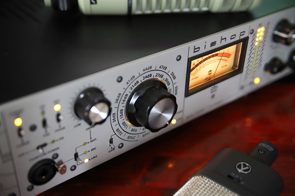 BISHOP all tube channel unit brings much more than you expect from a regular high quality channel strip. The heart of the unit based on the mic preamp which consist three vacuum tubes constructed in all tube design. There are inputs for the mic and instrument on the front while mic and line also selectable on back panel. Over the regular switches of phase, polarity and phantom power we found a special drive pot which is available for colouring the instrument input through a discrete solution. The big enlighted eye catching ring for stepped gain selector is separated in two selectable scales which gives ultimate capabilities to make gain even until +60dB.
