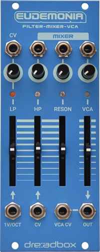 Eudemonia är en Eurorack-modul som är ett filter, mixer och VCA i en modul. Dubbla filter varav ett 24 dB lågpassfilter och ett 18 dB högpassfilter. 3-till-1 mixer, exponentiell VCA med peak-indikator (över 10pp) med mera. Eudemonia är 10HP bred och 35 mm djup.