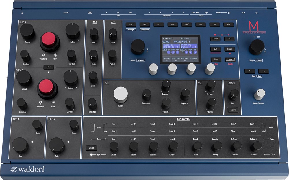 With M, Waldorf are musically returning to their roots by bringing back classic Microwave and ‘modern’ Microwave II tone generation as a new-generation classic hybrid wavetable synthesizer with an analogue lowpass 24 dB/Oct VCF — SSI 2144 Improved Ladder Type — with resonance and analogue saturation feature, true stereo analogue VCA with panning option, and much more to explore in a desktop-friendly form factor featuring a wide range of unique sounds. M has a total of 16 banks with 128 memory slots each. The included sound presets – 1024 in total (divided into 8 banks of 128 sounds) — professionally programmed by world- renowned sound designers also include all of the classic Microwave sound sets, such as MW1 Factory Sound Set, MW1 Soundpool 1-5, the fat-sounding Analogue and Bassco, as well as PPG Wave 2.3 sounds cleverly converted for the original Microwave. Moreover, it also features freshly-programmed sounds utilising M’s myriad new features — from true hard Sync (when working in its Modern Microwave II/XT mode) to the ARP (arpeggiator) and MIDI-syncable global LFO (Low Frequency Oscillator).