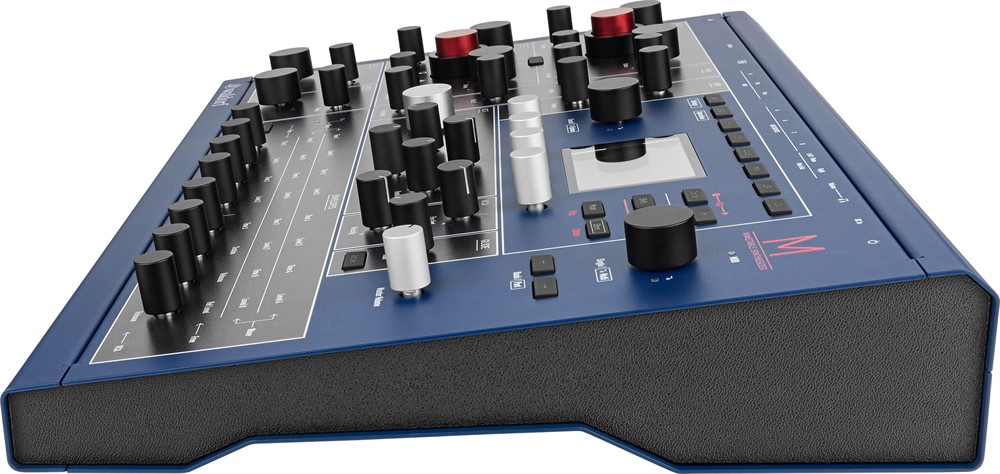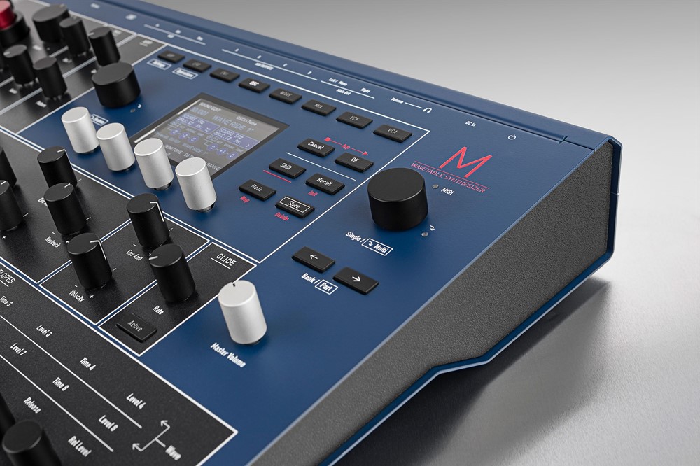 But beating at M’s musical heart as an eight-voice polyphonic, four-part multitimbral WAVETABLE SYNTHESIZER — as boldly blazoned in red across its full-metal blue- coloured casing, itself hinting at its illustrious Microwave heritage — are two wavetable oscillators with independent wavetable-generating Classic Microwave 1 and Modern Microwave II/XT modes, meaning that the wavetable oscillators behave differently in both of those modes (accessible by pressing the Mode button beside the helpful high-resolution graphic display with four endless encoders for yet more hands-on control). Consequently, there is no hard Sync or ring modulation available in the Classic Microwave I mode, where 16-bit wavetables are bit-reduced to 8-bit and a 240 kHz non-anti-aliased sample rate is offered, whereas the Modern Microwave II/XT mode offers a 40 kHz sample rate with band-limited wavetables, although both oscillators — OSC 1 and OSC 2 — offer the same panel parameters.