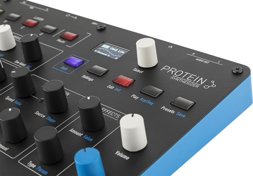 Protein är en kompakt och prisvärd 8-rösters wavetable-synt i desktop-format. Baserad på de ursprungliga Microwave 1-ASIC-oscillatorerna, kombinerade med moderna funktioner från Iridium-serien såsom avancerad arpeggiator, step sequencer, chord-läge och omfattande effekter. Protein erbjuder wavetables som kan formas med envelopes och velocity-modulation, ett flexibelt filter med allt från kristallklar ton till rå "dirt", samt möjligheten att organisera de åtta rösterna i upp till fyra lager för komplexa ljud, eller multitimbral användning. Protein har två effekt-slots, tre envelopes, två LFO:er, modulationsmatris och stöd för polyfonisk aftertouch samt MPE. Synten levereras med över 150 fabriks-presets och plats för totalt 250, där lager enkelt kan kombineras med "Load Layer"-funktionen för snabb ljuddesign. Protein en liten men kraftfull synt som är lätt att ta med och lika inspirerande i studion som på resande fot.