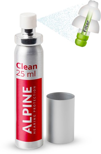 Alpine Clean is a handy disinfectant cleaning spray. You can use it to clean ear protection products, such as earplugs and ear muffs. Most bacteria and viruses are killed within a few minutes after spraying the ear protection product with Alpine Clean. The spray disinfects thoroughly, easily and quickly. The liquid does not leave any residue, is not sticky and dries quickly. Alpine Clean comes in a smart aluminium aerosol.
